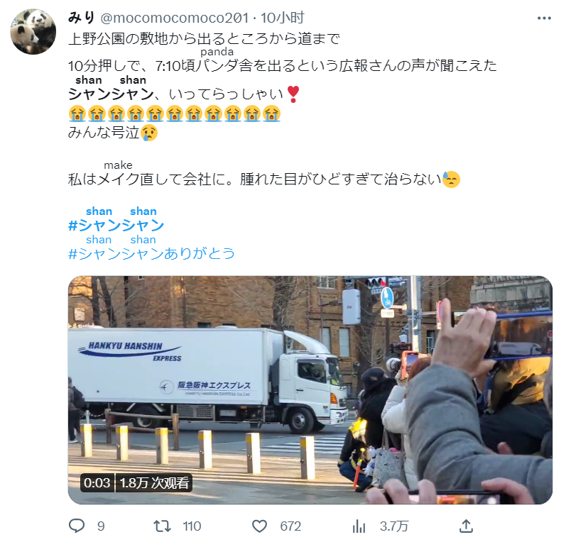 日本民众对香香的爱超乎想象。每次去看香香都要大排长队,很多人为她的周边疯狂上头,离别这天他们一路追到机场,真爱粉在现场难过到流泪,说自己没法离开香香。