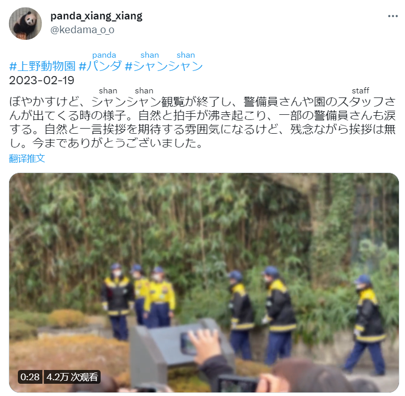 “在上野公园送别香香的现场,7点10分准时响起了广播声:祝愿香香一路顺风。