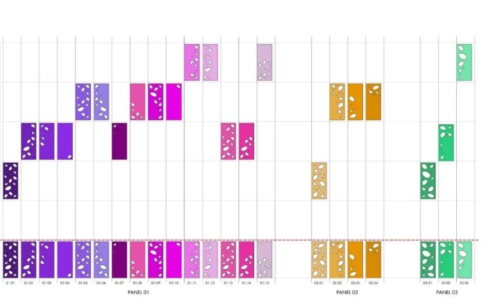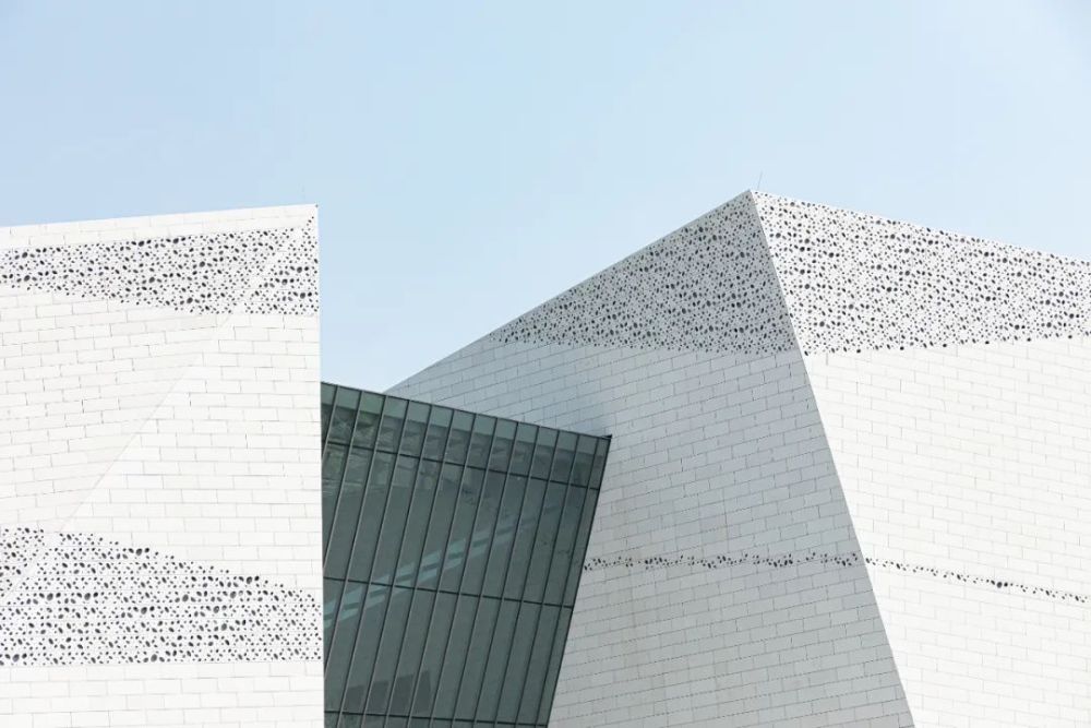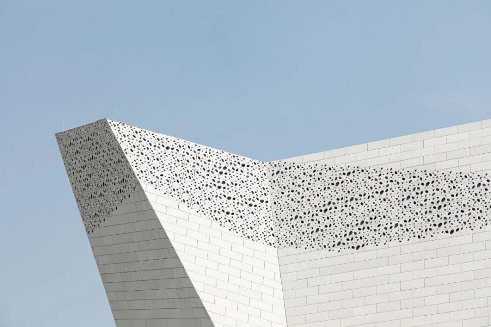 石材上形态各异、有机分布的穿孔,在白天能模拟出皑皑白雪覆盖山顶的景象,夜晚又会被LED从背后照亮,宛如璀璨繁星。