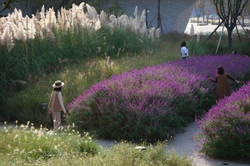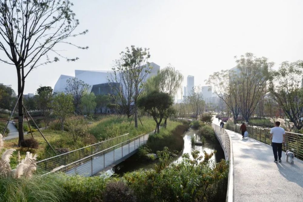 植被形态、肌理与色彩彼此交织,打造出富有层次感的台阶式景观带,以图形化的方式致敬了成都古代梯田景观的几何形态。设计团队通过种类丰富的植物类型和地貌营造出独特的体验——湿地公园、竹园、睡莲花园,以及季节性的植物园。