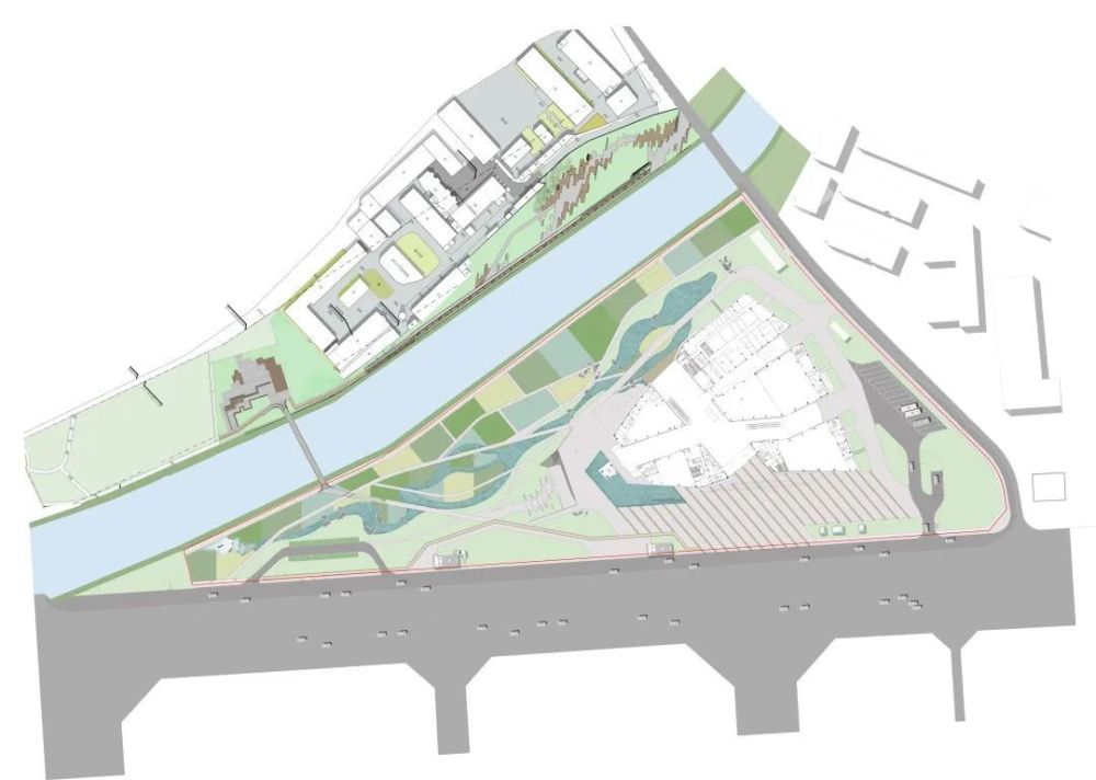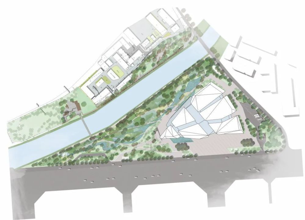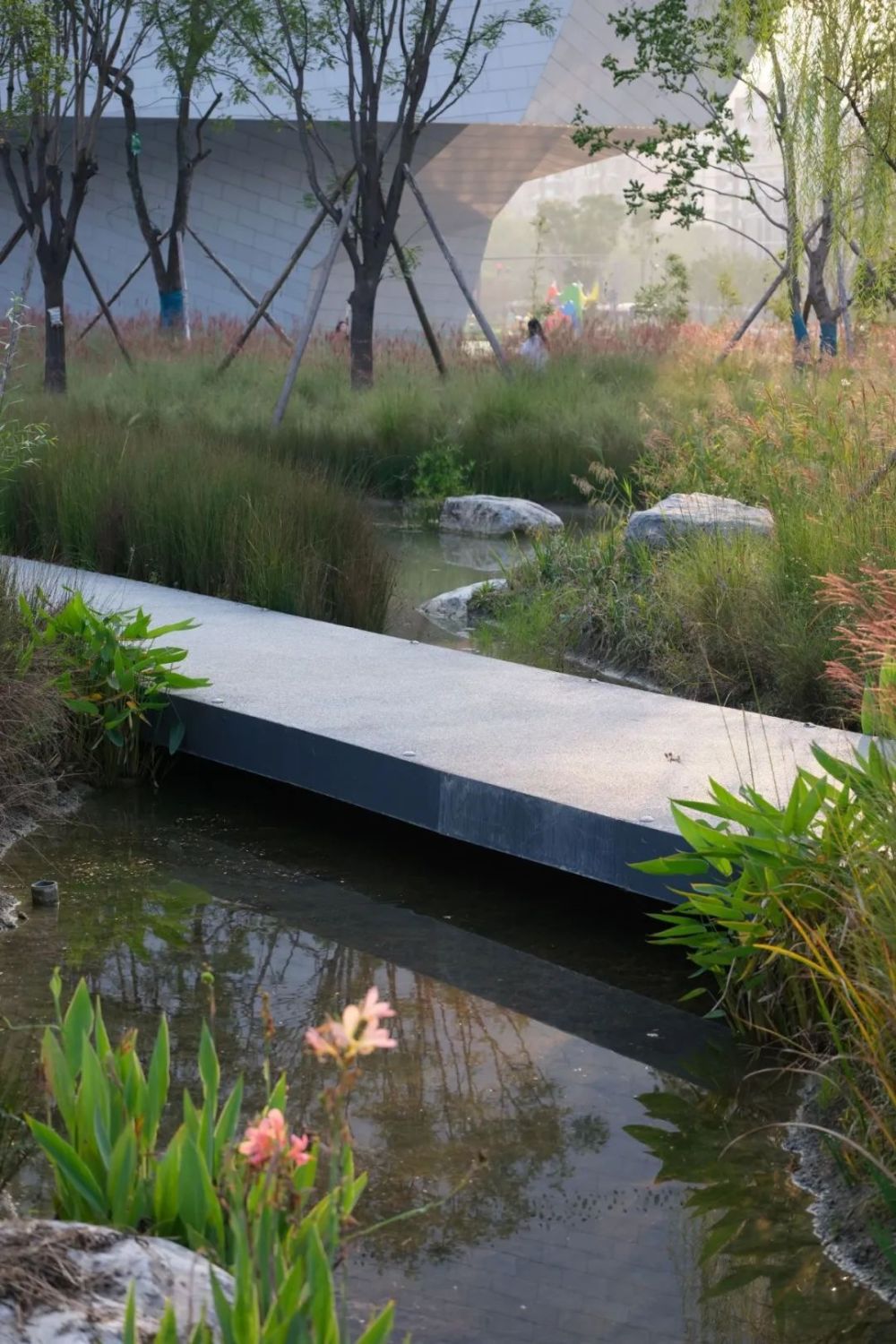 现有的东风渠位于场地东侧,设计以蜿蜒于景观之中的水道与散落布置的倒影池与其呼应,滨水步道和人行天桥穿行其中,相得益彰。