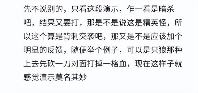 除了老生常谈的游戏背景及UI问题外,对于新公开的战斗场景,有玩家也是吐槽表示游戏在战斗中做的一些反馈不到位,比如最开始视频让人看起来像是3A中常常出现的“暗杀”戏码,但是角色在潜行后一刀并没有明显的视觉标识。