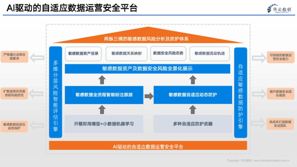 华云数创自适应数据安全运营平台,用于帮助客户保护自己组织内的敏感数据或核心数据资产。对组织内的客户信息、财务数据、知识产权、业务数据等进行智能分类分级及风险评估,并结合用户行为分析智能地采取细粒度、自适应的保护措施。