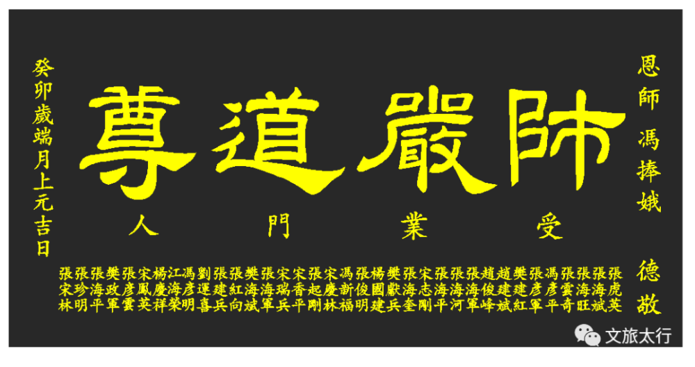 匾面版式及内容,山雨有自己的考虑:以匾词为中心,读法应为“恩师? 冯捧娥”,您受到应有的尊敬,您一生的辛劳自然也会受到敬重。在此岁尾年头,元宵佳节来临之际,您的学生35名联名送匾,是因为您“以德可敬”——德敬!