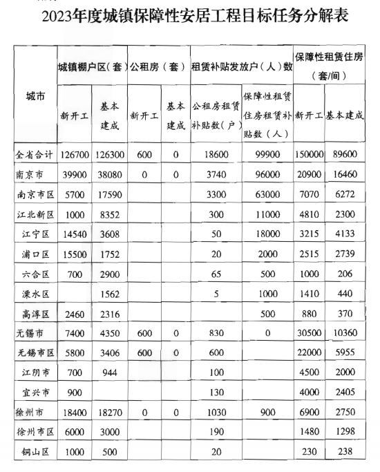 新开工城镇棚户区12.67万套、基本建成12.63万套,新开工(筹集)保障性租赁住房15万套(间)、基本建成8.96万套(间),新开工公共租赁住房600套,发放公租房租赁补贴1.86万户、发放保障性租赁住房租赁补贴9.99万人……这些目标任务已纳入2023年度江苏省民生实事。