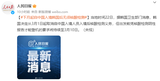 当地时间22日,据韩国卫生部门消息,韩国决定从3月1日起取消自中国入境人员入境后核酸检测义务,但出发前凭核酸检测阴性报告才能登机的要求将持续至3月10日。