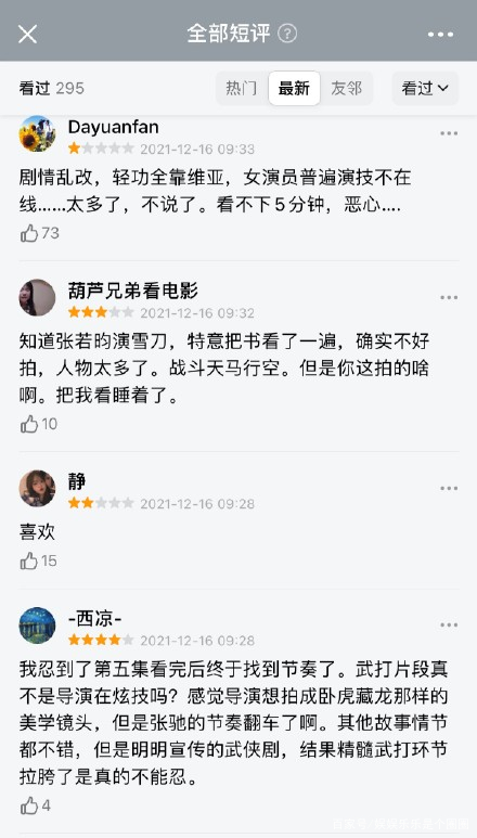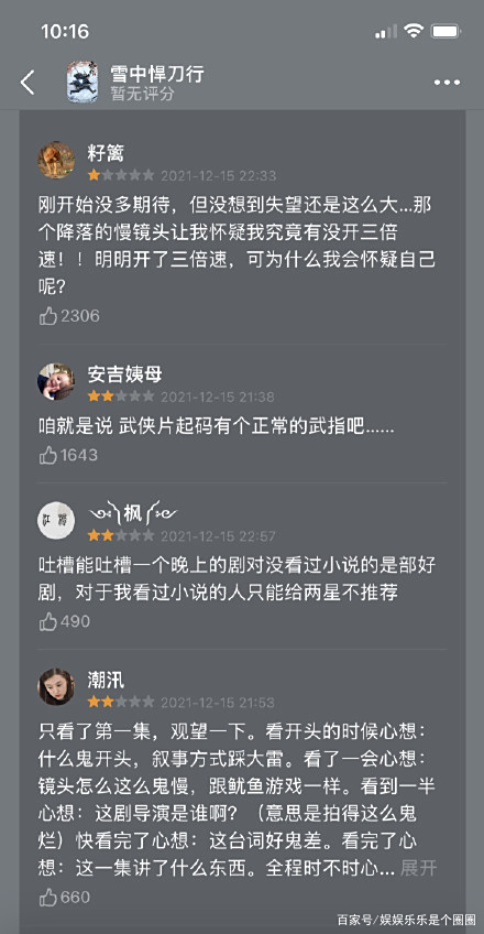 圈圈看了剧,网友们的吐槽也不是没有原因的!《雪中悍刀行》首播收视一个劲的跌。节奏拖沓、打戏拉胯、滤镜奇怪,只剩下“装”可以吹了!现在拍剧净搞些光怪陆离、荒腔走板的东西,忽视了最核心的内容质感。真的是有一些失望的!