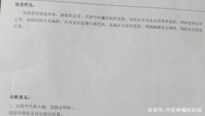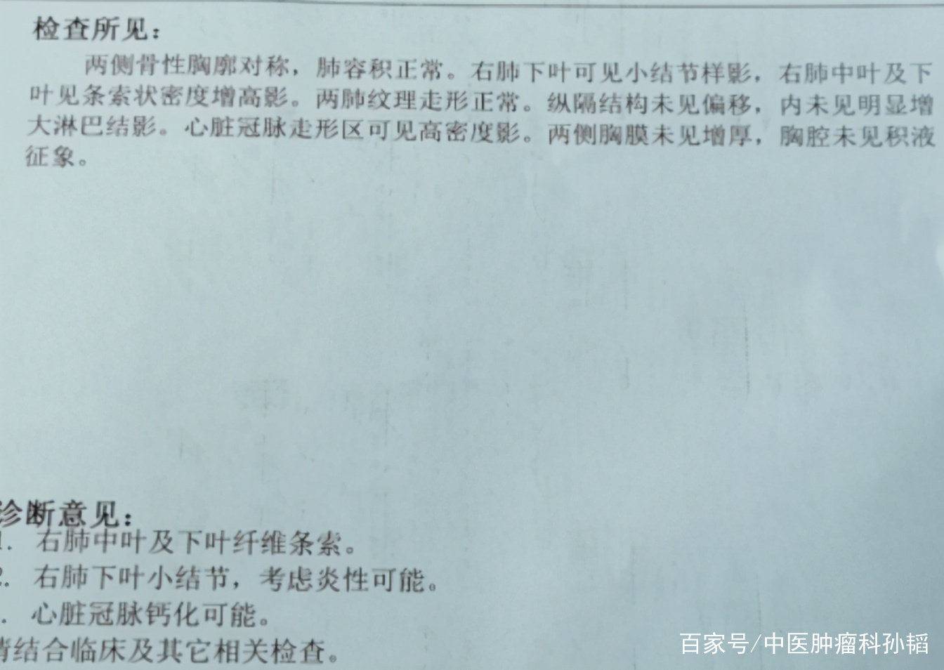 到医院检查身体,发现右肺下叶小结节,医生建议进一步观查,定期复查。我感觉不能等!因为我母亲就是去世的,听说这个有很大的遗传因素,我不想等下去挨一刀,那样太痛苦了,我还有很多事情没有做,我还没有看到孙子,我闺女还没硕士毕业,所以我身体一定不能有事,想着有没有好的中医,可以中药调理下试试。