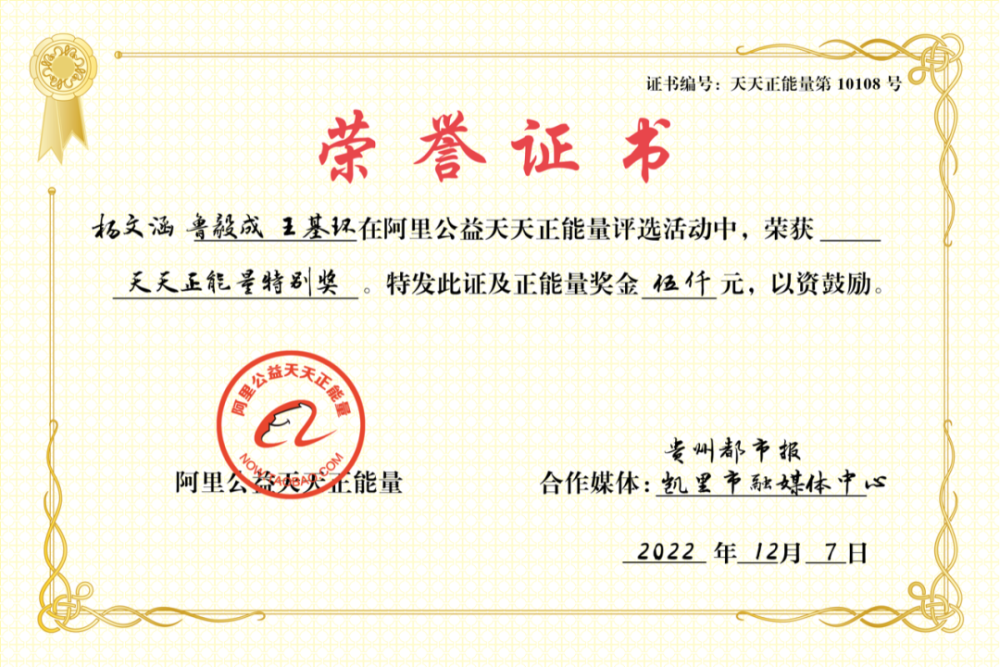 为杨文涵、鲁毅成、王基环颁发正能量特别奖及奖金5000元