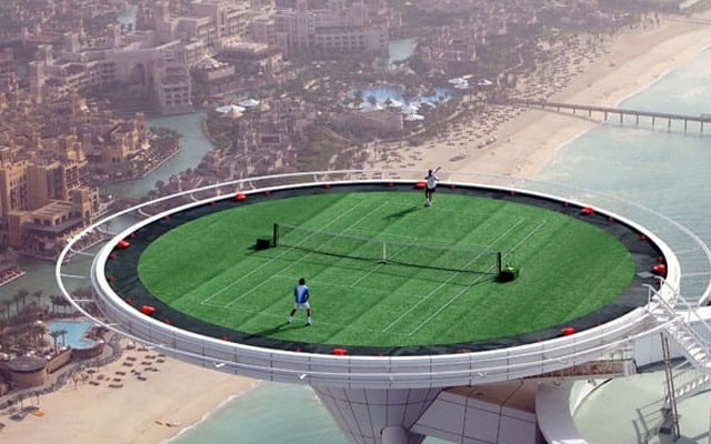 这个网球场距地面 1,000 多英尺,位于超级豪华的 Burj al Arab 酒店的顶部。罗杰·费德勒和安德烈·阿加西受邀在这个天堂般的球场上进行一场友谊赛,但我们想知道如何有人真正在那里打球而不感到不安!此外,如果球飞出球场并击中地面上的某人,会不会一颗流弹打中我脑袋。