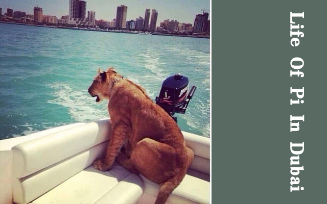 男子与他可信赖的狮子在一艘豪华游艇上,金钱可以让你在迪拜做任何破天荒的事情......