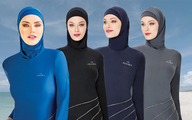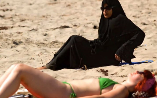 女性在海滩上穿罩袍,但我们预计随着布基尼的流行,罩袍终将除去。