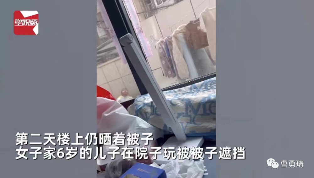 过了一会儿,女子家6岁的儿子在院子里玩的时候,被邻居晒的被子给挡住了。他便忍不住在院子里直接和楼上“理论”起来,女子哭笑不得,并无奈调侃:儿子都比自己厉害。