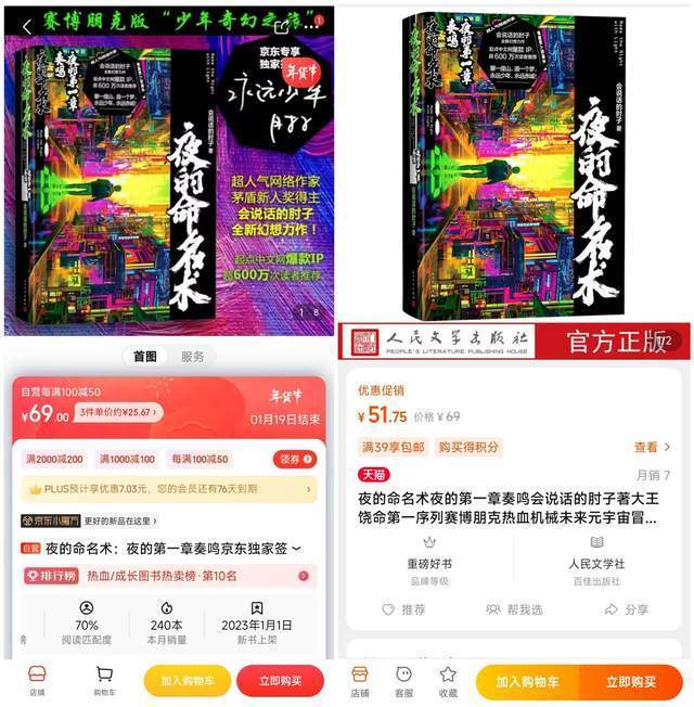 1月1日,《夜的命名术》实体书出版第一册,但是发售十天销量才两百多本,其中某东上卖的是签名版50块钱,销量240本,某宝上面是普通版也是50块钱,月销7本。咱就是说,你这好歹也是为数不多均订破10万的网文,签名版的10天才卖了240本。