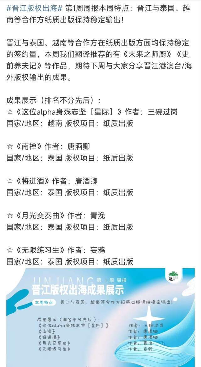 在本周晋江的出海周报中,有四本书出版泰国,一本书出版越南。除了第四本《月关变奏曲》是一男一女的恋爱甜文,其余四本皆为耽美。每个国家都会有腐女喜欢看耽美,这我理解,但我就想问,泰国人妖变了性之后会喜欢看这种吗?