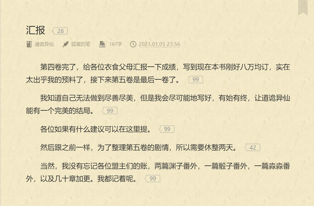 1月5日,《道诡异仙》第四卷完结,作者也是发了个成绩汇报给大伙,说目前小说已经八万均订,照这个势头下去,估计《深空彼岸》十万均订之后的下一本十万均就是道诡了。