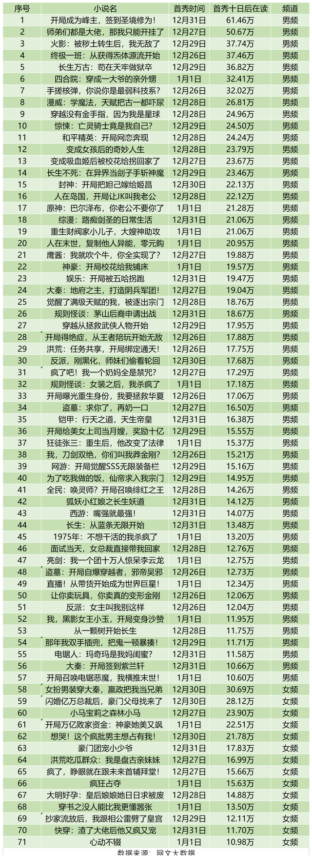 这周的番茄,首秀十日在读破十万的小说比上周还多了十本,流量持续增长,其中男频57本,女频14本。估计是快到年了,各地纷纷开始放假,大伙闲的有时间看小说了,所以才会出现这种流量暴涨的情况。不过,正如我所说的,虽然番茄目前的流量在不断增长,但小说间的内卷也在加速。1月1日至10日,番茄开启首秀的小说共有2943本。其中男频小说有1669本,女频小说有1274本。也就是说,短短十天,番茄新增了近三千本签约且字数达到十万字的小说,比起点和飞卢这些大站多了十几倍。所以啊,别看番茄目前首秀十日在读过十万的小说多,但背后那是踩着几千本书上来的,不知道有多少书辛苦写到十万字首秀结果成绩不行就切了的。