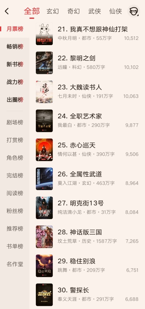 第21到30名这个区间的小说可以说的话题其实不少,不过可能是因为每周我都会说,导致现在我也有点腻了。