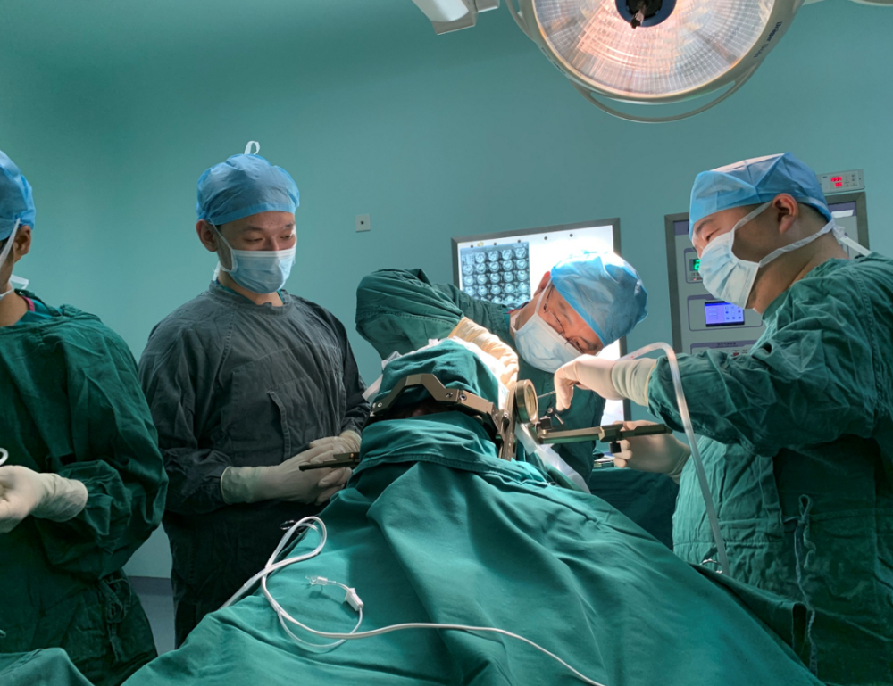 11月15日,在头部立体定向定位技术辅助下,通过头部不到2cm的微创切口,易伟教授团队将直径约为1mm 的电极,置入颅内相应神经核团靶点,为小张成功实施了脑深部电刺激手术。