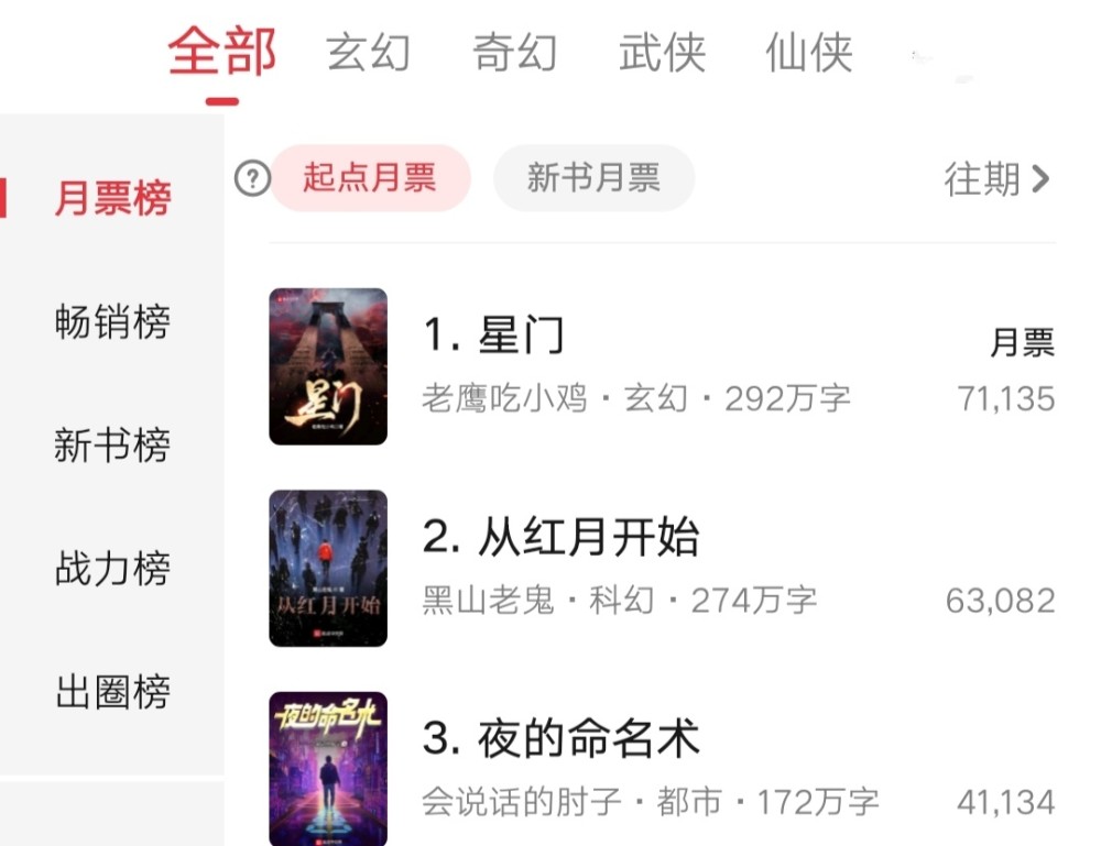 大家好,我是佛门射手,第一时间给您带来小说力推、作家趣闻和IP改编的介绍,希望喜欢的读者关注点赞评论来一波,今天跟大家说的是起点的月票榜。