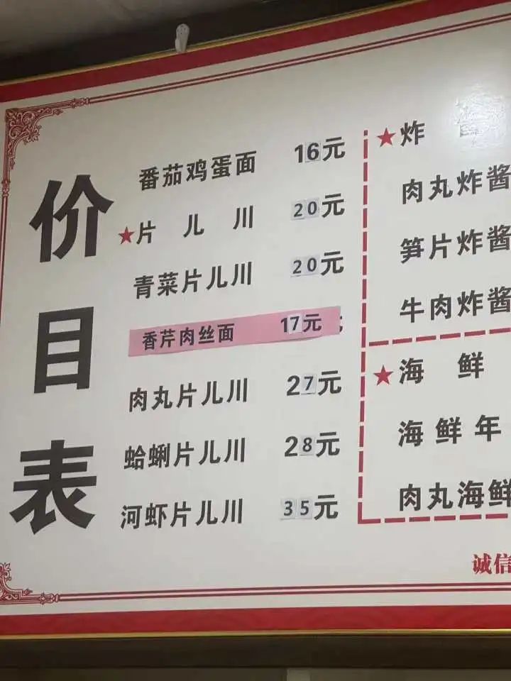 片儿川20元一碗,蛤蜊片儿川28元一碗,香芹肉丝面17元一碗,河虾片儿川35元一碗。