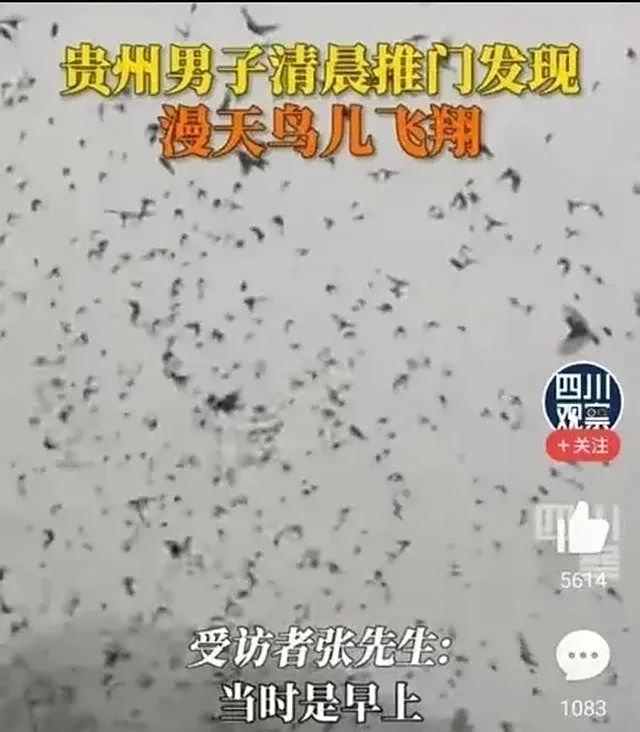 四川成都网友2.5日拍摄到在成都的天空上出现密密麻麻的飞鸟,这些鸟儿四处乱飞,在天空不断盘旋,然后撞向大树,似乎受到惊吓。