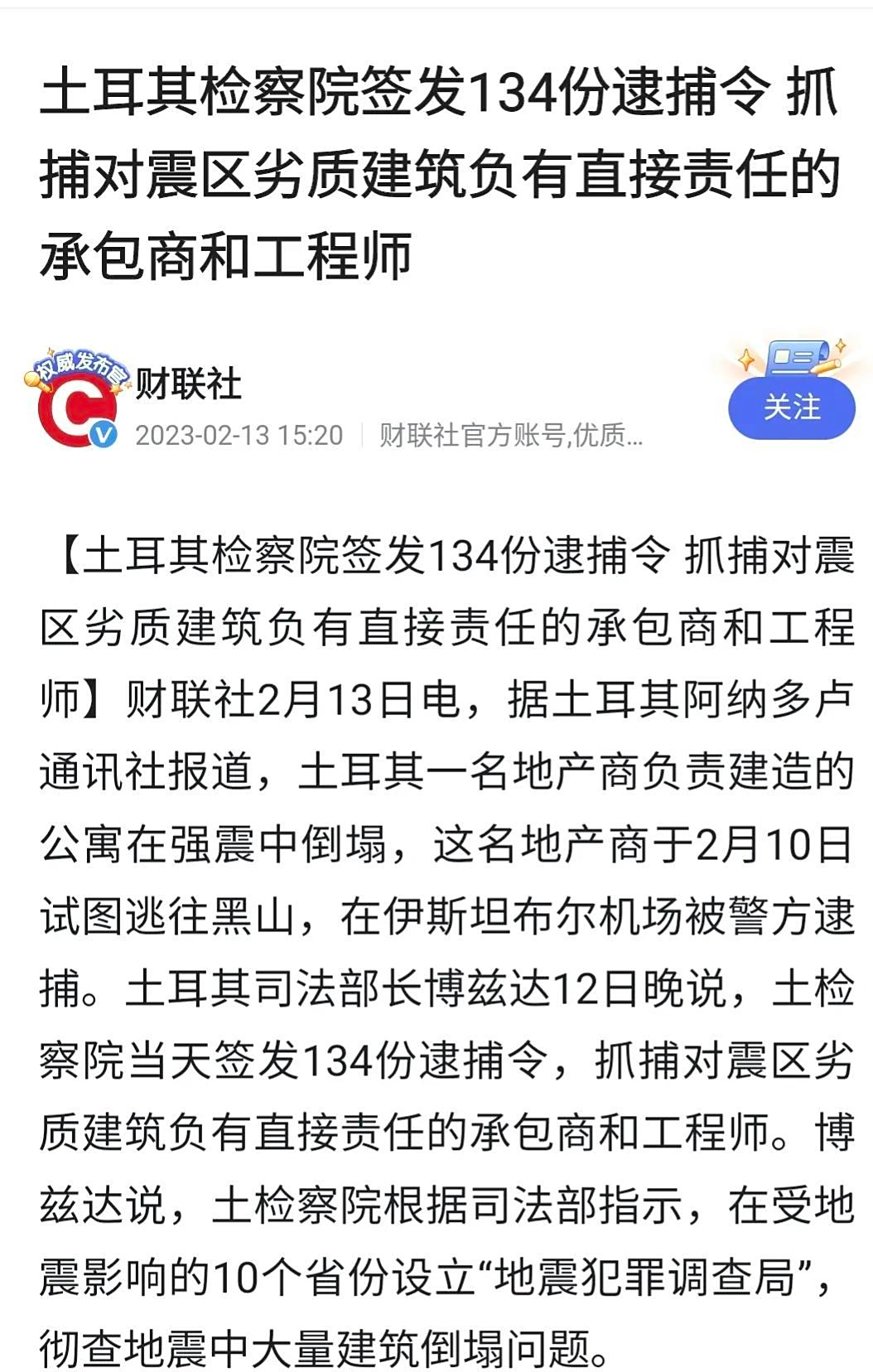土耳其检察院签发134份逮捕令,下令抓捕对震区劣质建筑负有直接责任的承包商和工程师。