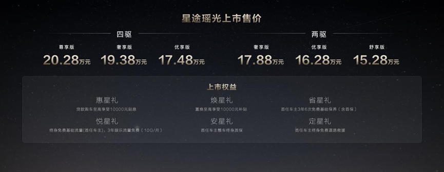 二月二、龙抬头(2月21日),星途瑶光正式上市。新车共推出2.0TGDI两驱、2.0TGDI四驱两种车型共6个版本,售价区间为15.28-20.28万元。