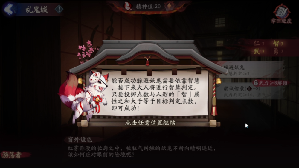 在这里,我们将跟随晴明大人的脚步,操纵拥有「仁」、「武」、「智」、「勇」4个属性的人形,在剧目中探索事件,走向不同的结局。