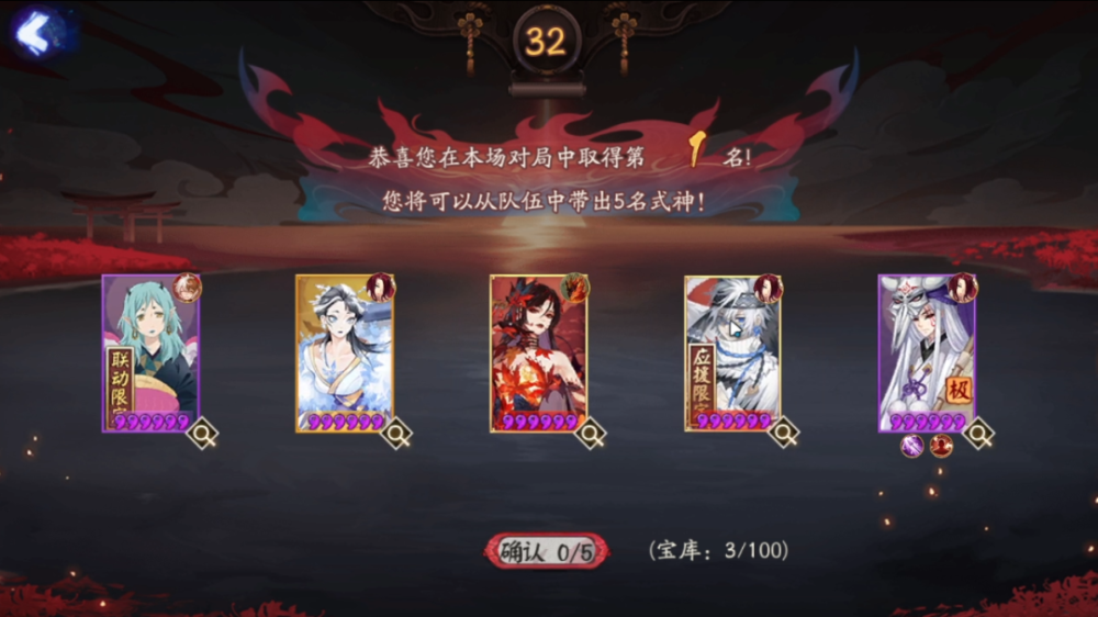 16人模式不能带入行囊式神,但若能在16人模式中获得第一名,则可以选择一位式神加入宝库中。