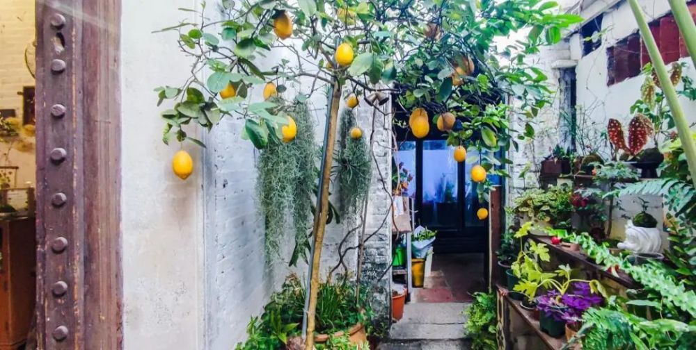 从这个前厅的圆拱门穿过,便来到了一个绿意盎然,生机勃勃的小天井,各式各样的绿植在这里生长。其中,最引人注目便是挂满了黄澄澄果实的柠檬树。