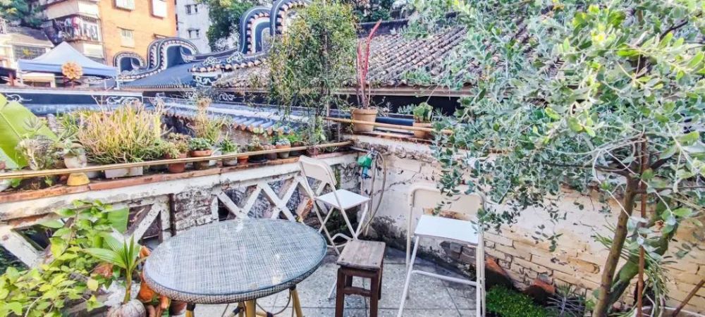 站在露台向上望去,岭南古建筑的镬耳墙和鱼鳞般的瓦顶清晰可见,沧桑厚重的历史感顿时扑面而来。向下看去,则刚好看见店前的小花园。每天Lonely Plant店员们会把一些好的作品摆放在门前小花园供街坊、市民们参观和挑选。