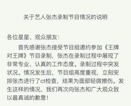2018年3月,张杰在录制《王牌对王牌》的一个危险环节时缺氧晕倒,半边脸拍在凳子上。事后,节目组也在微博上对张杰进行道歉。