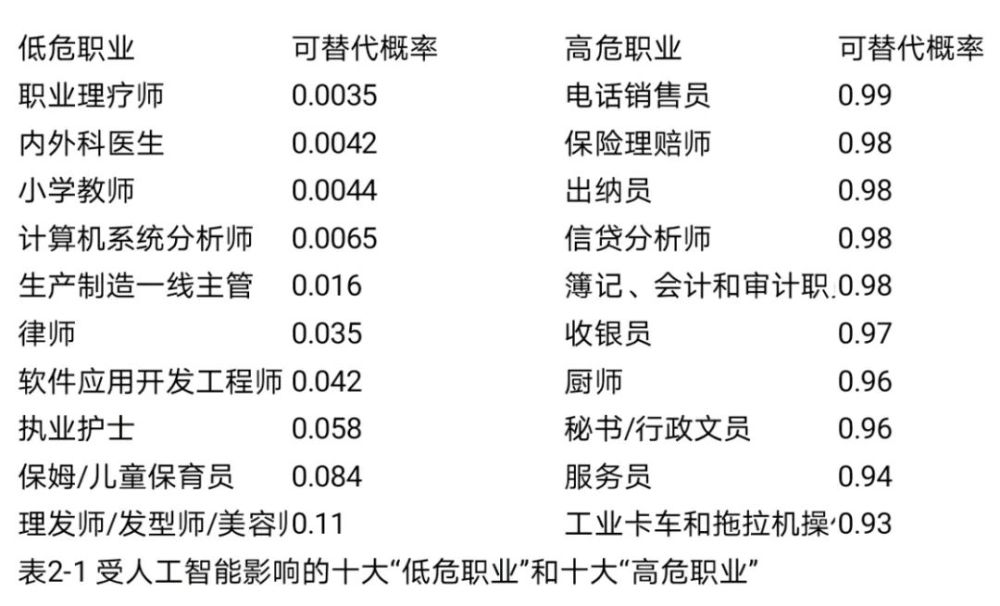 在2019年到2021年的时间节点上,人工智能对可编码型之间的冲击逐渐成为现实,在技术变革的冲击下,很多位曾经位于金字塔顶端的职业,也变成了西西弗斯的那一块令人绝望的石头。牛津大学的两位经济学家计算了702个细分职业的人工智能可替代率,在下面表中分别列出了受人工智能影响的具有代表性的10种低危职业和10种高危职业,大家可以参照一下。
