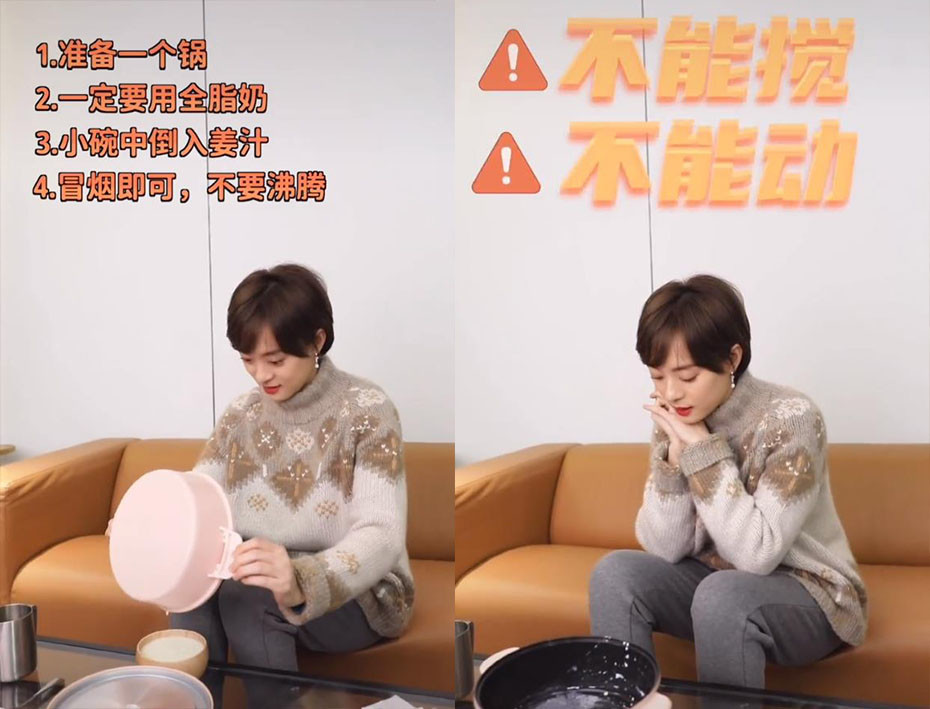 在制作过程中,孙俪尽显心灵手巧,每一个细节、用什么材料都是讲解得相当清楚,还列举了4个关键步骤,例如牛奶一定要选择全脂的啊,牛奶煮至冒烟即可,不要沸腾,牛奶倒入姜汁后不能搅,不能动……