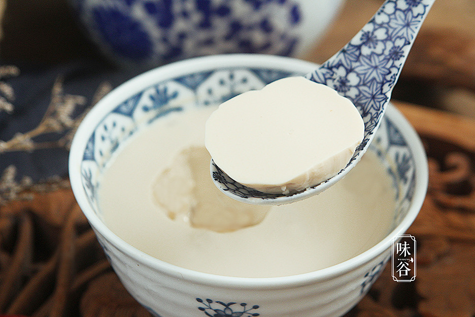 4、检查是否凝固,把汤勺放牛奶表面,不下沉即表示凝固了,姜撞奶的表面也呈现出质地非常光滑细腻的光泽,看来就很诱人,如果放进冰箱冰镇过后,果冻般的口感会更加强烈。