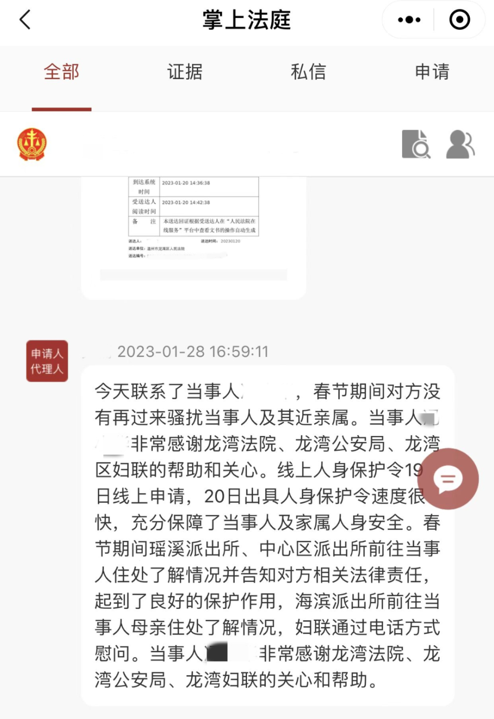 节后,李某通过代理人向龙湾法院发来了感谢留言:“春节期间对方没有再过来骚扰,非常感谢龙湾法院、公安局、妇联的帮助和关心。1月19日线上申请,20日就出具人身保护令,速度很快,充分保障了当事人及家属人身安全……”
