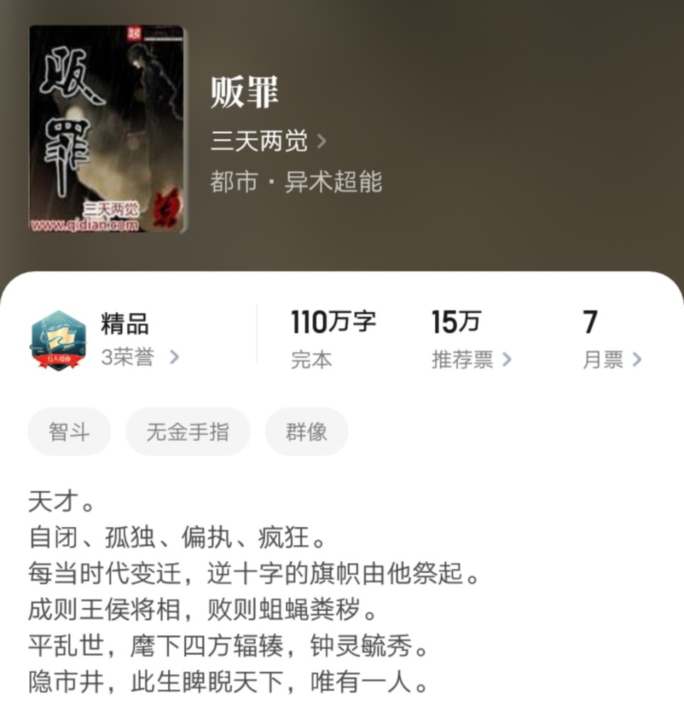 第二本小说《贩罪》,目前是三天两觉小说中口碑最好的一部。不过当初连载的时候,仍然是没有什么成绩的。