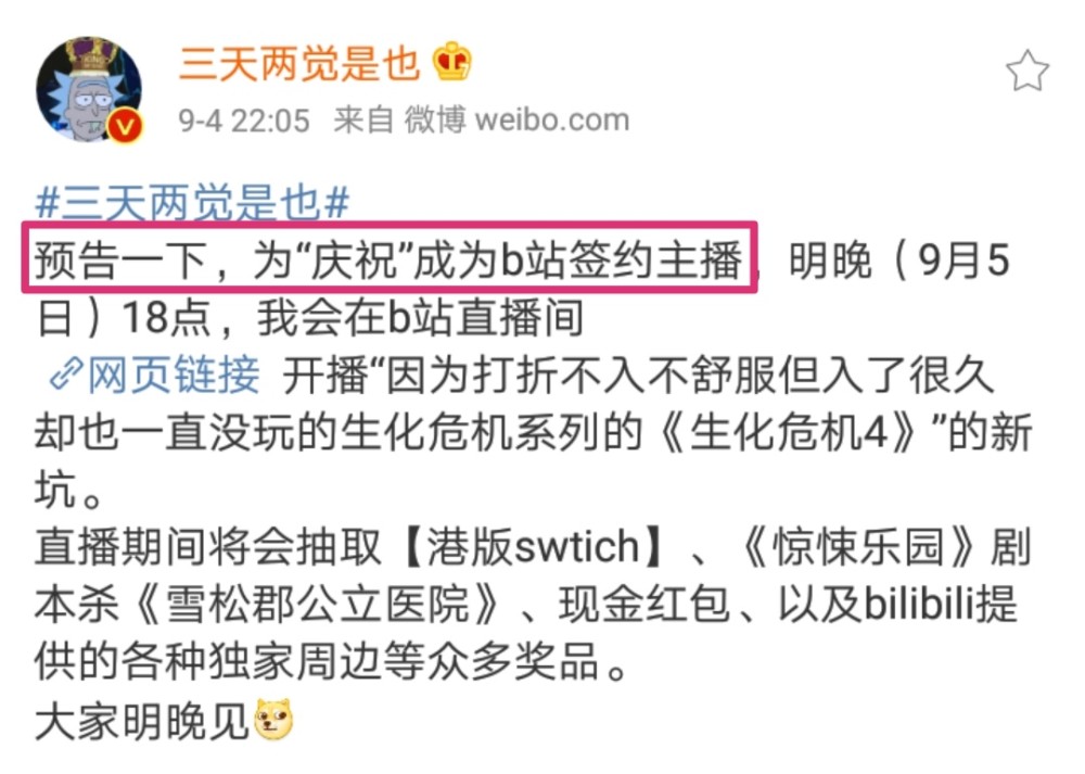 就在四号晚上,知名网文大神三天两觉在B站和微博官宣了自己签约B站主播的消息。这激起了一众粉丝的热情。