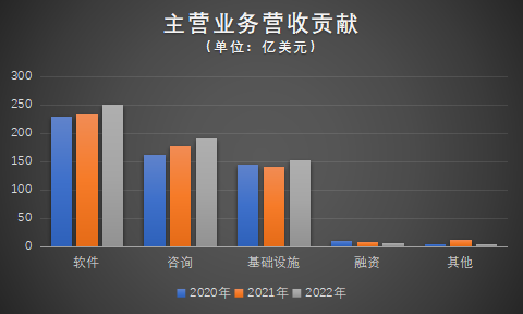 就具体业务而言,2022年,IBM的软件、咨询、基础设施等三项主营业务收入皆较2021年有所增长,分别为250.37亿美元、191.07亿美元和152.88亿美元;融资业务收入则从2021年的7.74亿美元减少至6.45亿美元;其他收入也同比有明显减少。