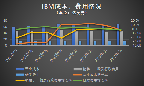 营业成本方面,在经历了2019年、2020年的同比缩减后,2021年、2022年,IBM的营业成本皆同比增加。其中,2022年Q1、Q2、Q3的营业成本分别同比上升11.40%、13.82%、8.66%,2022年Q4其营业成本同比略有下降。