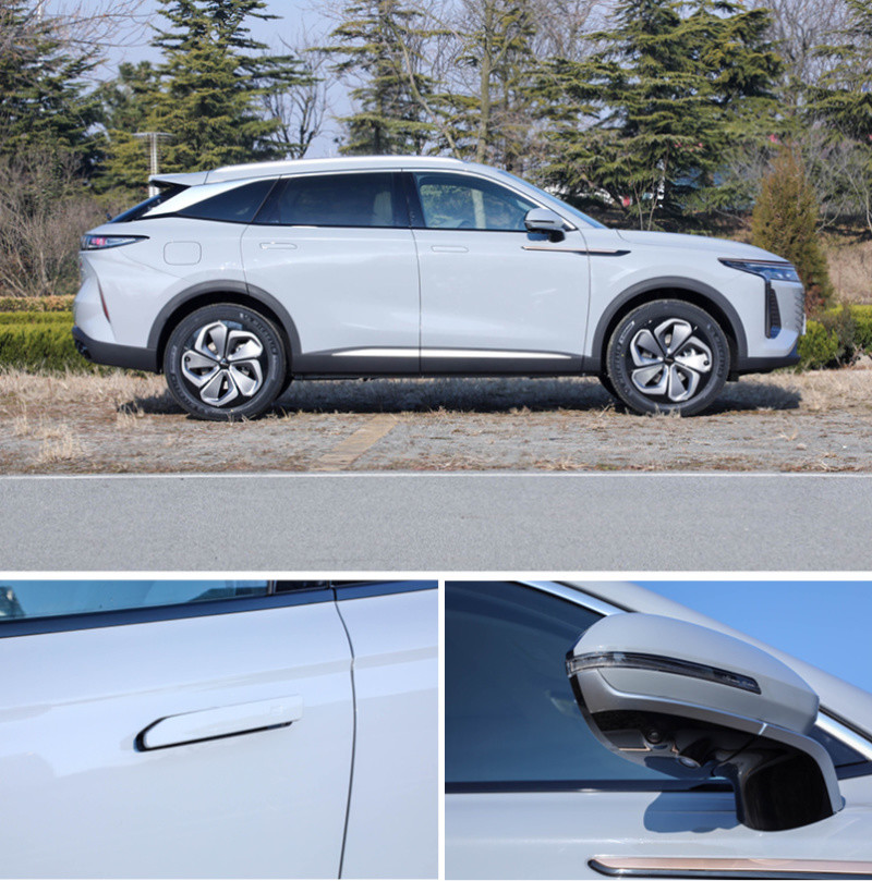 来到侧面,星途瑶光采用了时下流行的溜背式车身。车身侧面的整体设计相当简洁,隐藏式门把手也没有缺席。车顶线条从A柱顶点便开始下探,再加上大幅倾斜的D柱设计,也让瑶光更多了一些轿跑SUV的感觉。至于在车身尺寸方面,瑶光的长宽高为4781/1920/1671mm,轴距为2815mm。