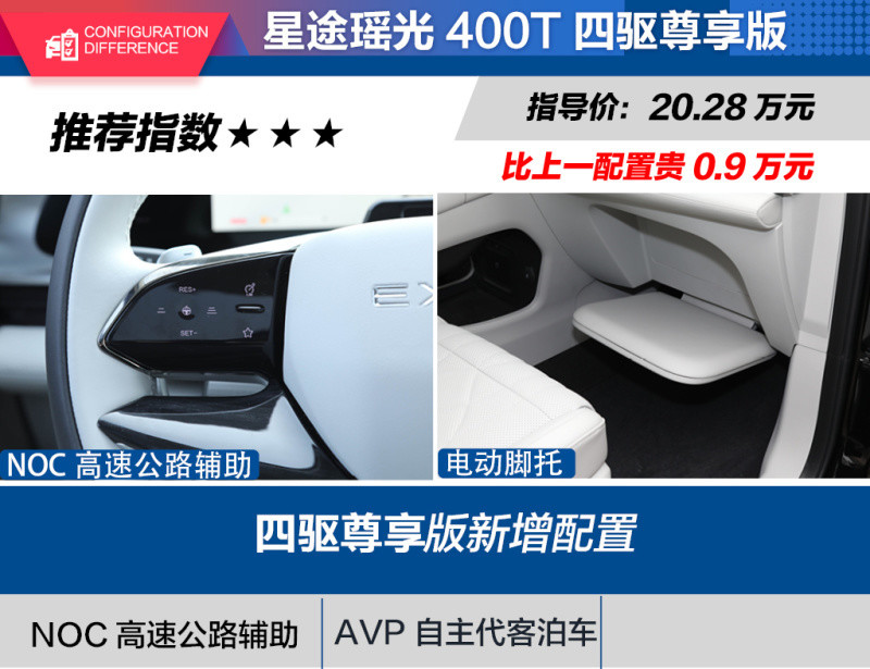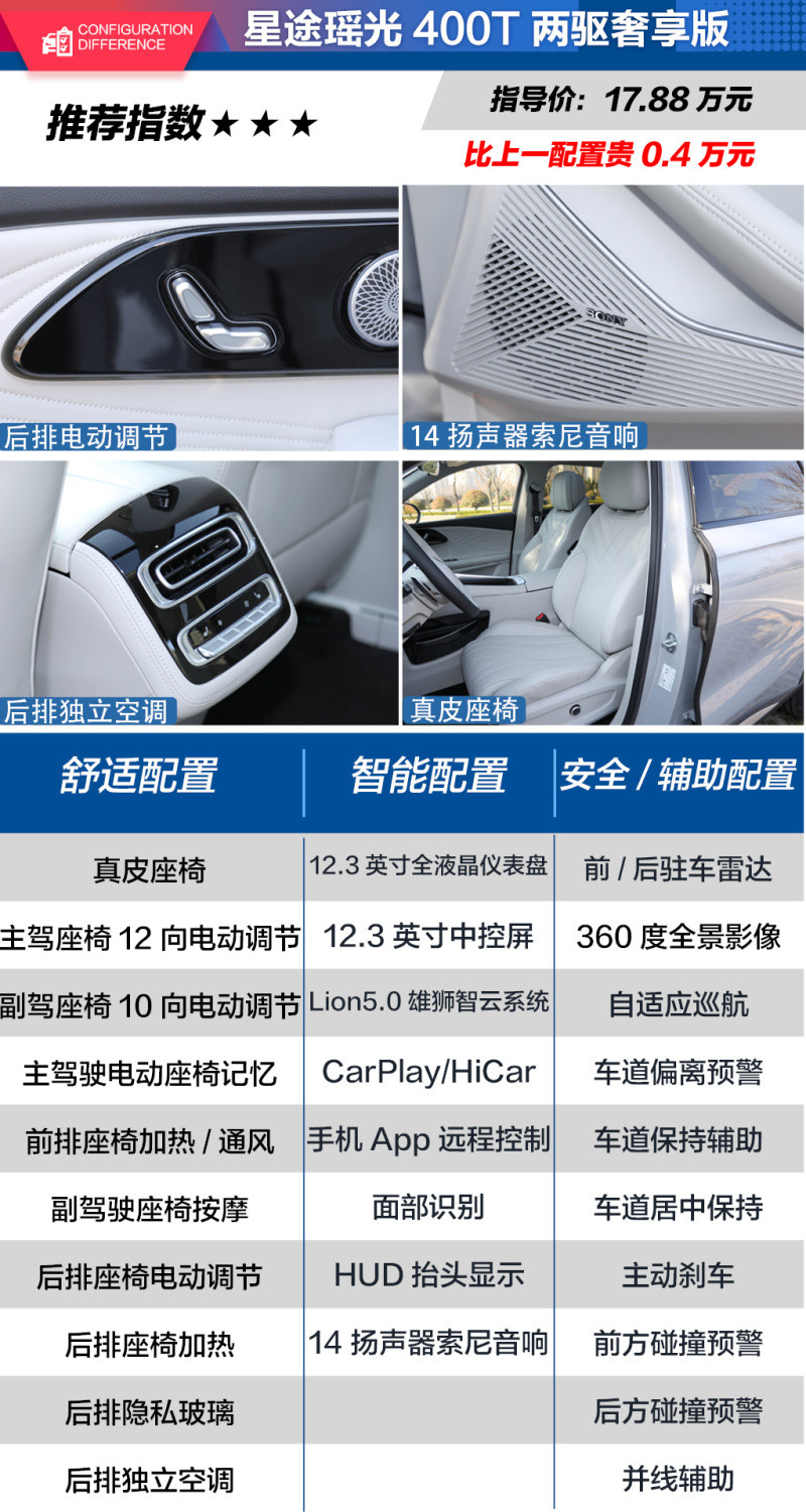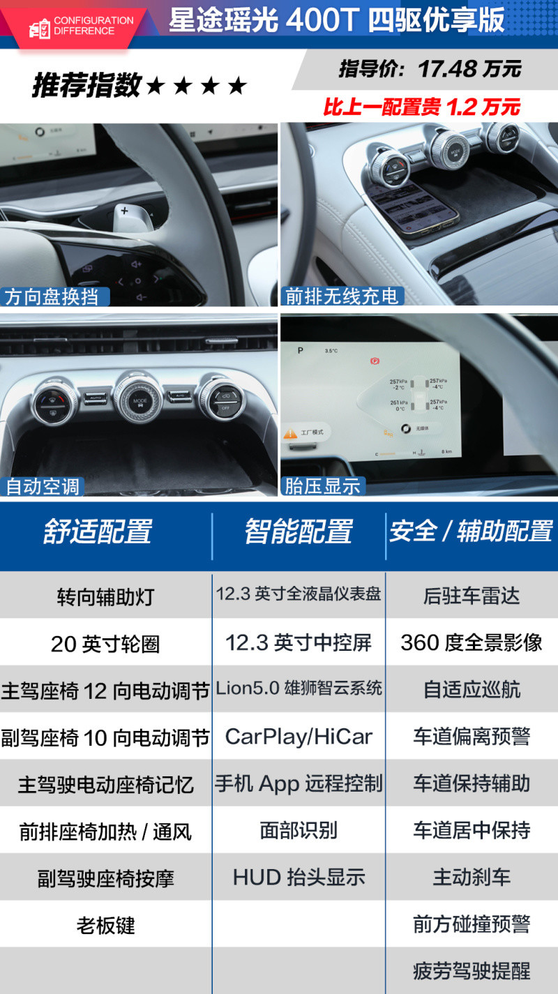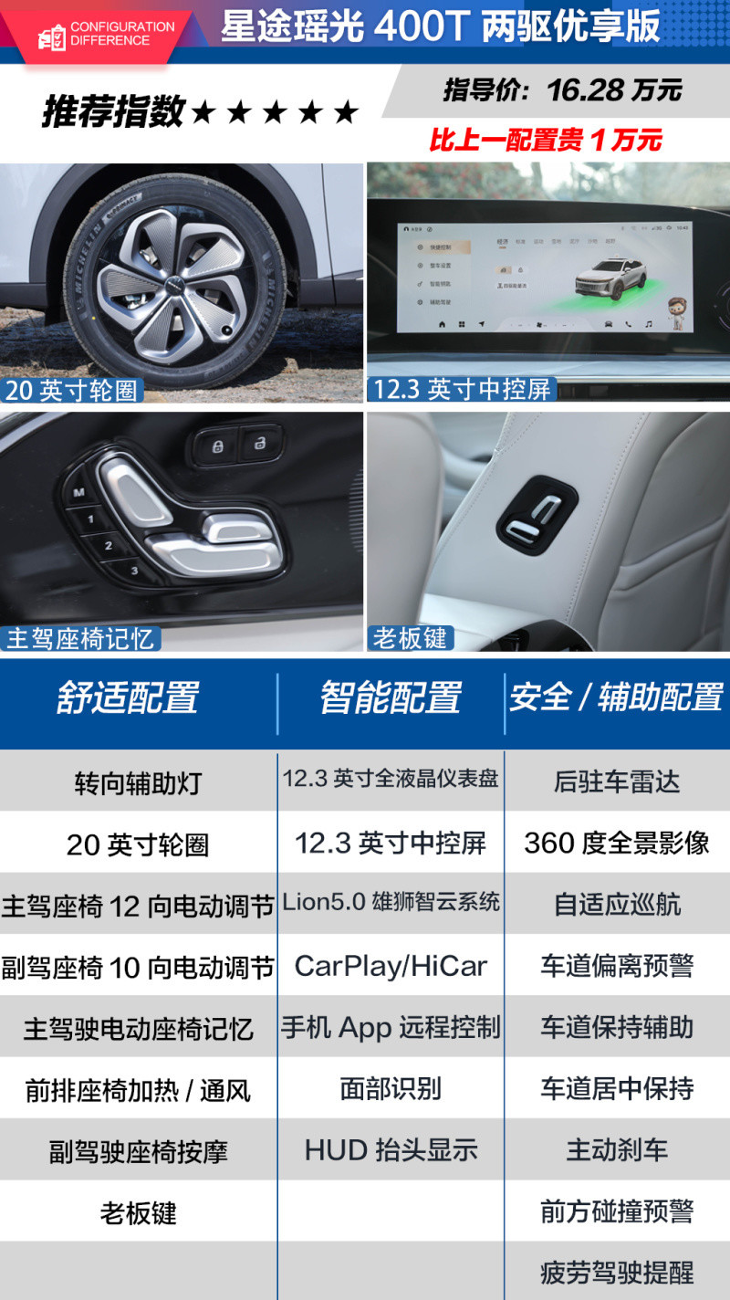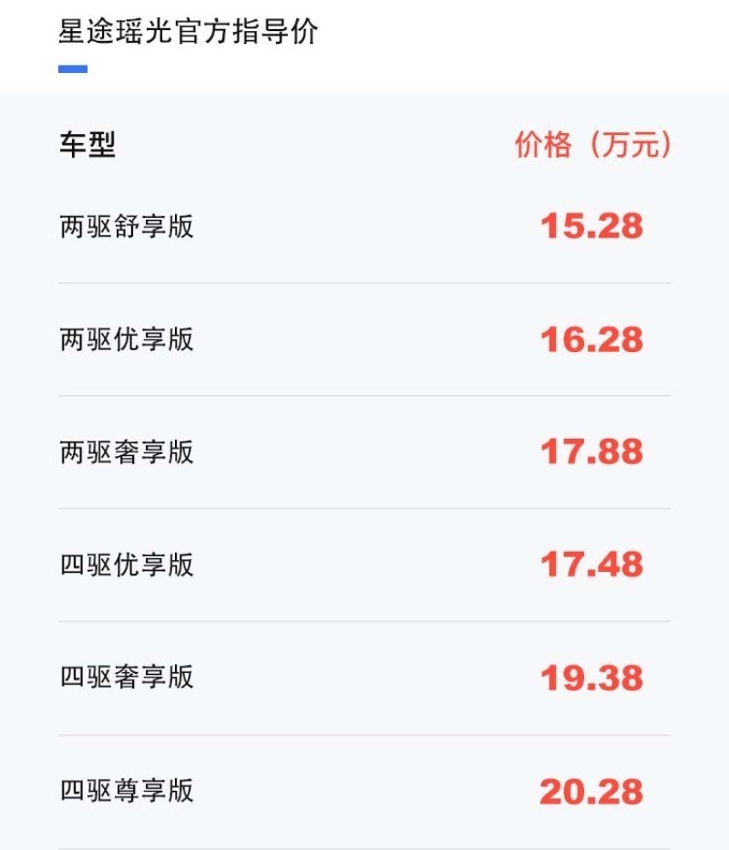 编辑点评:星途瑶光展现出来的产品力还是让人眼前一亮的,看得出星途品牌对于高端化有着自己的追求。那么如果你想要选择这辆星途瑶光的话,我认为售价16.28万元的两驱优享版会是最好的选择,在舒适性配置方面,两驱优享版表现出了很不错的水准,各项基础配置也都相当丰富。至于说你如果比较想要一辆四驱车型的话,那么四驱优享版也是可以考虑的目标。而对于预算充足的用户,四驱尊享版也就是顶配车型同样可以考虑,毕竟它可以实现NOC高速公路辅助,这项功能在油车中还是比较少见的。