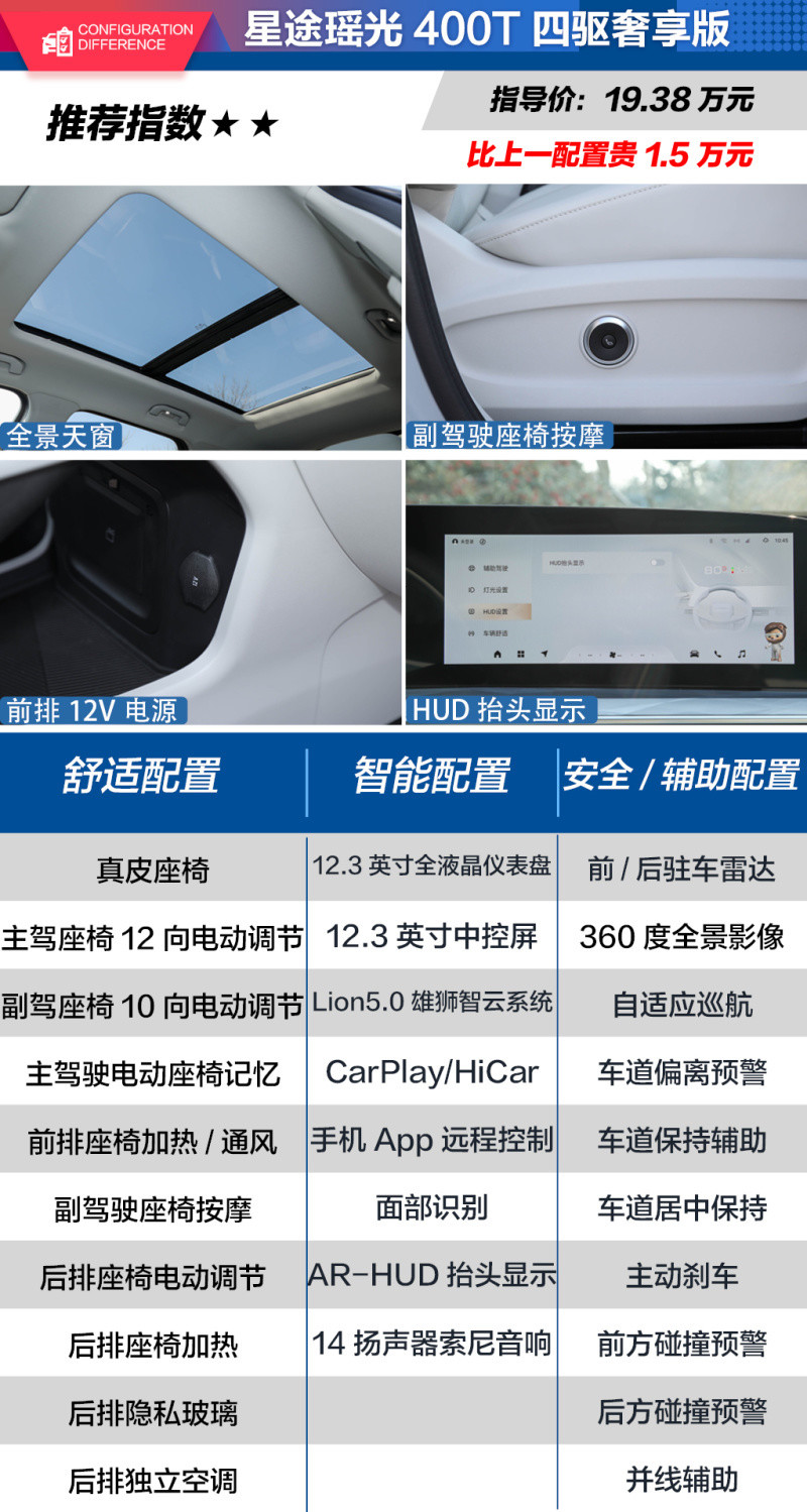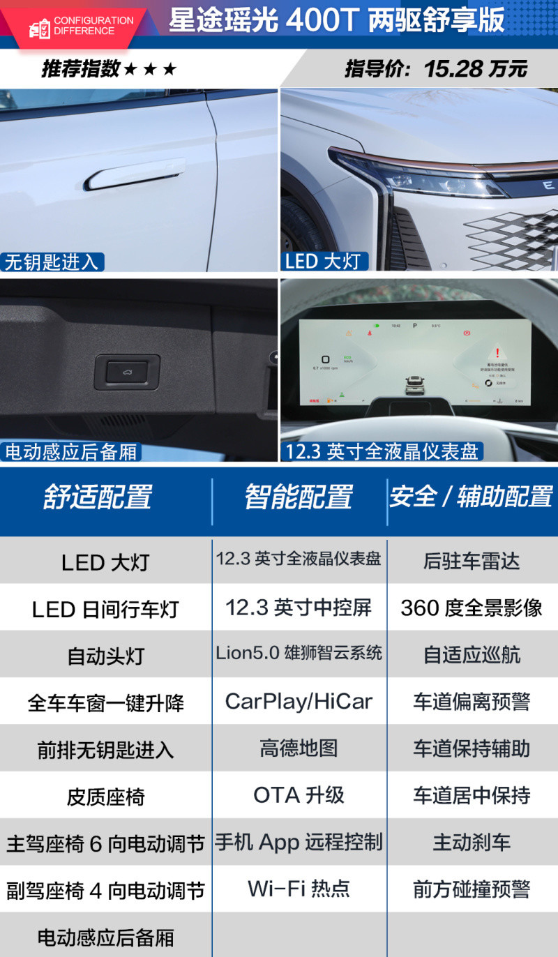 首先还是来看下全系最便宜的两驱舒享版吧,两驱舒享版的售价为15.28万元。虽然是全系配置最低的车型,但是两驱舒享版车型的配置水平并不寒酸。在舒适性配置方面,两驱舒享版不仅拥有LED光源的大灯和日间行车灯,还拥有前排无钥匙进入以及全车车窗一键升降。进入车内,车辆也拥有皮质座椅,主/副驾驶座椅分别支持6向和4向的电动调节。而在智能配置方面,星途瑶光可以说是做到了一视同仁,即便是全系最便宜的车型也拥有12.3英寸全液晶仪表盘和12.3英寸中控屏,中控屏还搭载了Lion5.0雄狮智云系统,同时再加上8155芯片的帮助能够让车机系统更加流畅,可实现的功能也更多。至于CarPlay/HiCar这些功能的接入也使得瑶光在智能配置方面更加完善。至于说安全/辅助功能方面,星途瑶光的配置水平也堪称丰富,最便宜的两驱舒享版也拥有360度全景影像、自适应巡航、车道偏离预警、车道保持辅助以及主动刹车等功能,已经可以实现L2级别的辅助驾驶功能了。可以看出虽然是全系最便宜的两驱舒享版车型,但是星途瑶光的配置也并不算低,如果只有15万左右预算的消费者完全可以选择这款车型。