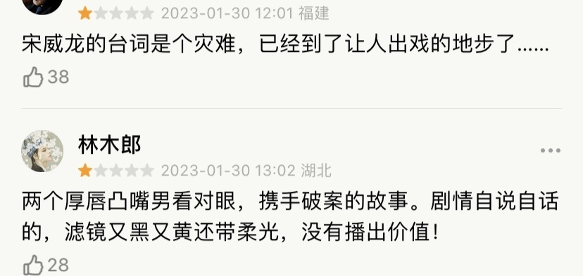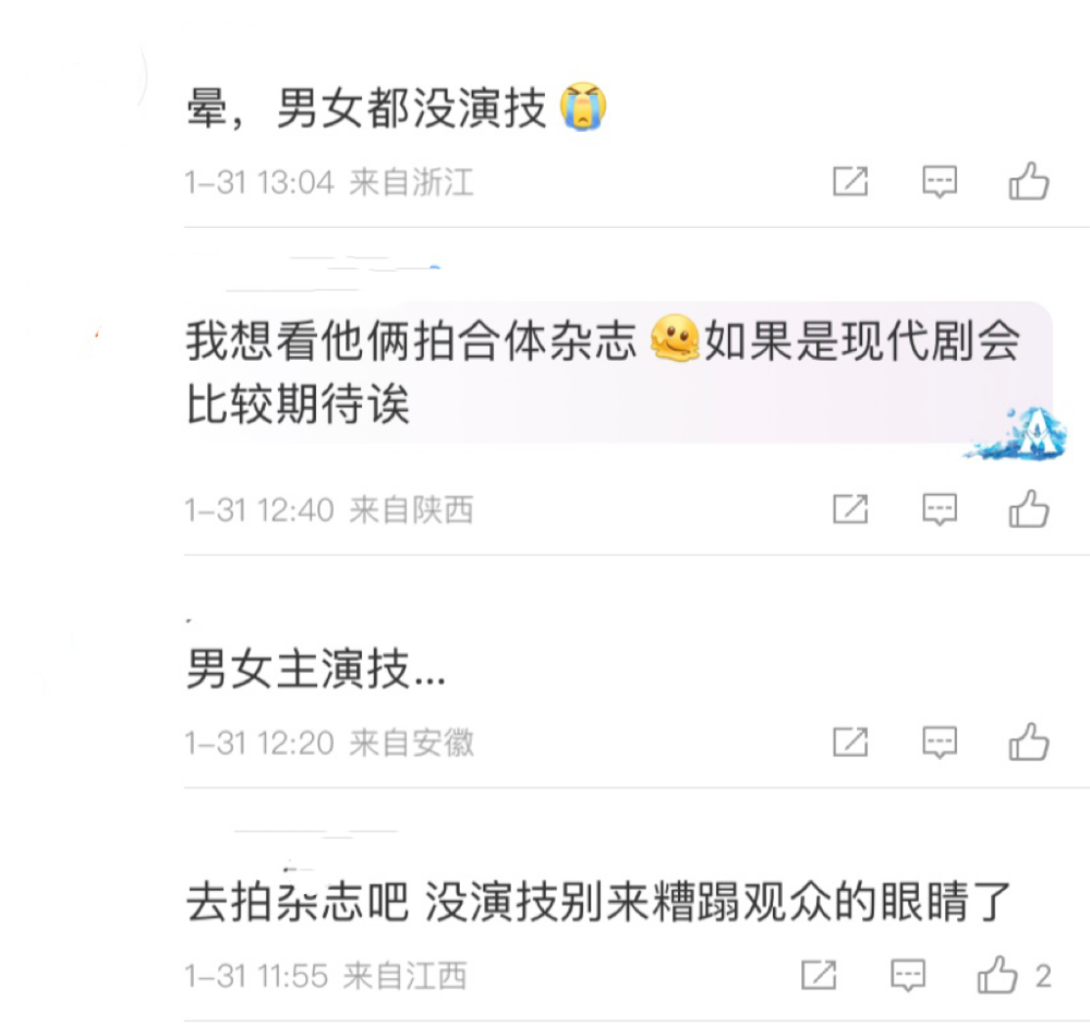 首先是两位主角baby和宋威龙,前者因为演技差、抠图备受诟病,而baby的影视资源也是肉眼可见的降级,不少观众在看到是baby主演的电视剧之后,纷纷大失所望,一点不抱期待。看来baby想要扭转口碑需要努努力,用实力说话了。