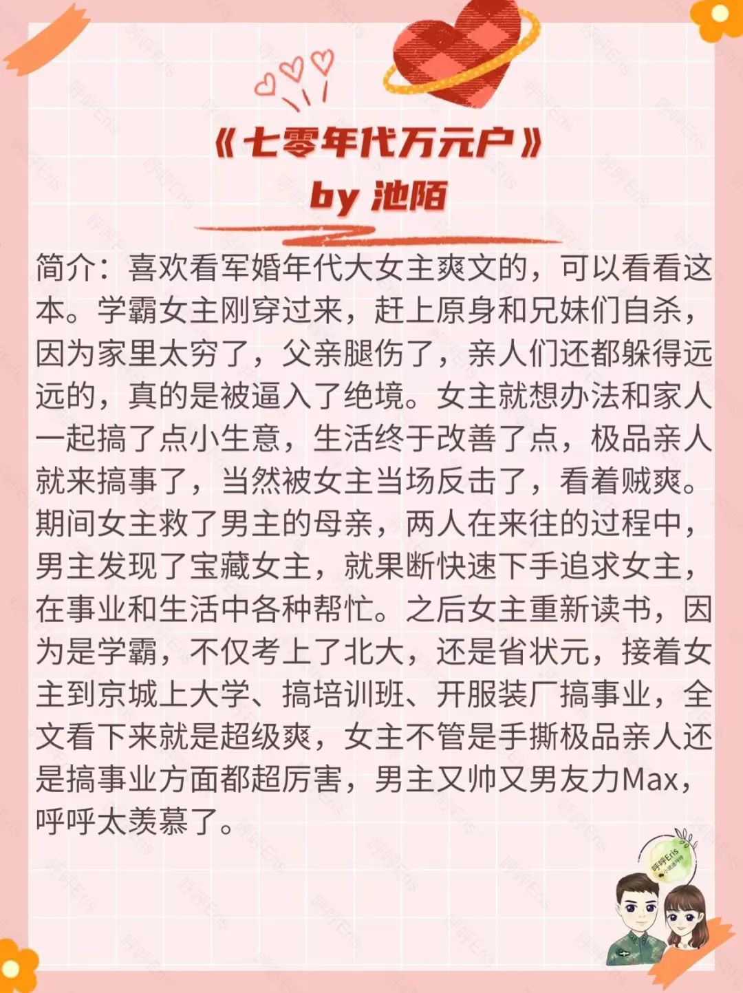 这本书女主是个双商在线的女学霸,男主是兵哥哥,喜欢军婚年代打脸虐渣爽文的宝子不要错过。这本书的女主是从2017年穿到了1976年,通过努力赚钱,带着家里的人一起变富。全文基本上都是女主轰轰烈的的搞事业,比如前期靠收鸡蛋、做衣服赚点小钱,然后考上大学后开培训班、纺织厂、倒霉古董生意之类的事业越做越大。女主的金手指就是自己,能力杠杆的。