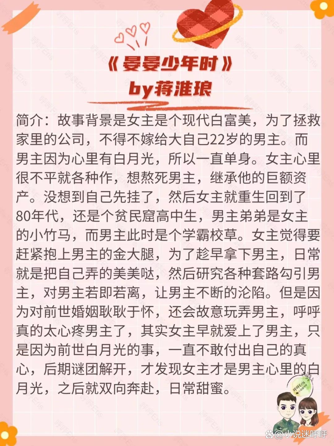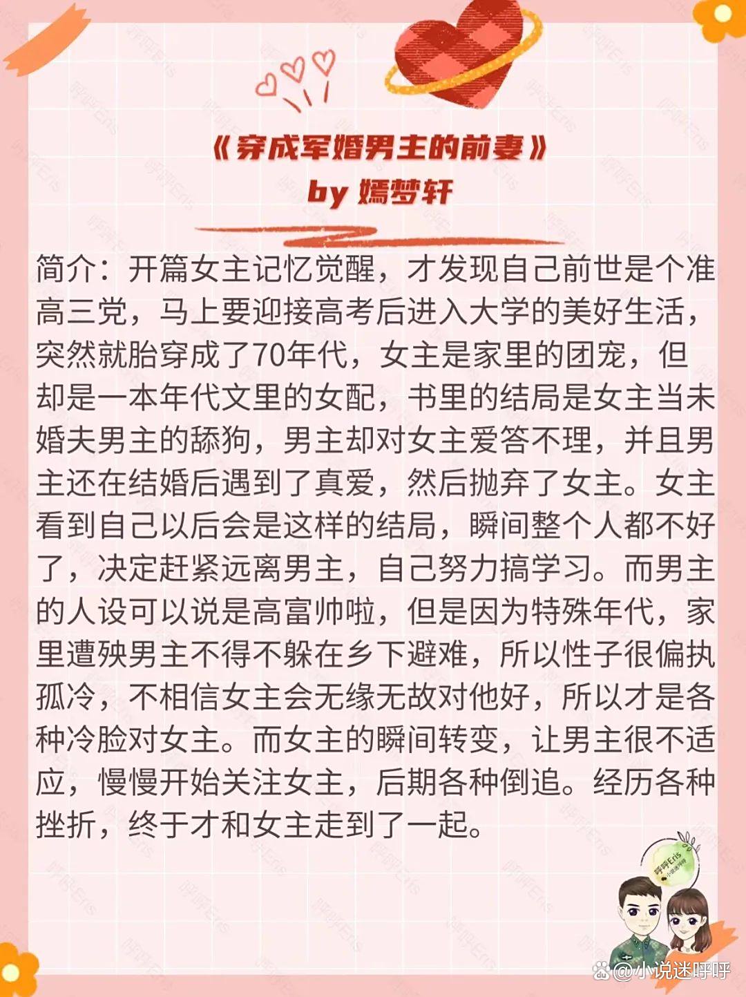 呼呼书评:这本书的女主是个心机爱财的绿茶女人设,男主是高高岭之花商界大佬,全文看下来太上头了。故事主要是讲女主在现代死了以后,重生回到了80年代,正好也是男主老公的高中时期,男主妥妥的学霸高富帅,女主为了以后还能过上富太太的日子,各种套路勾引挑拨男主,让年轻老公爱上自己,看女主各种攻略男主的过程,真的太精彩了,而男主人设真的是完美男友高富帅天花板了,果然这种男人只能活在小说里。
