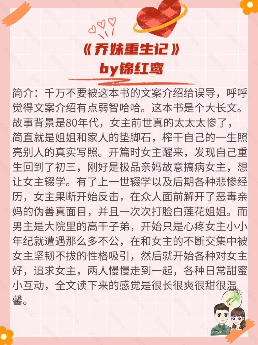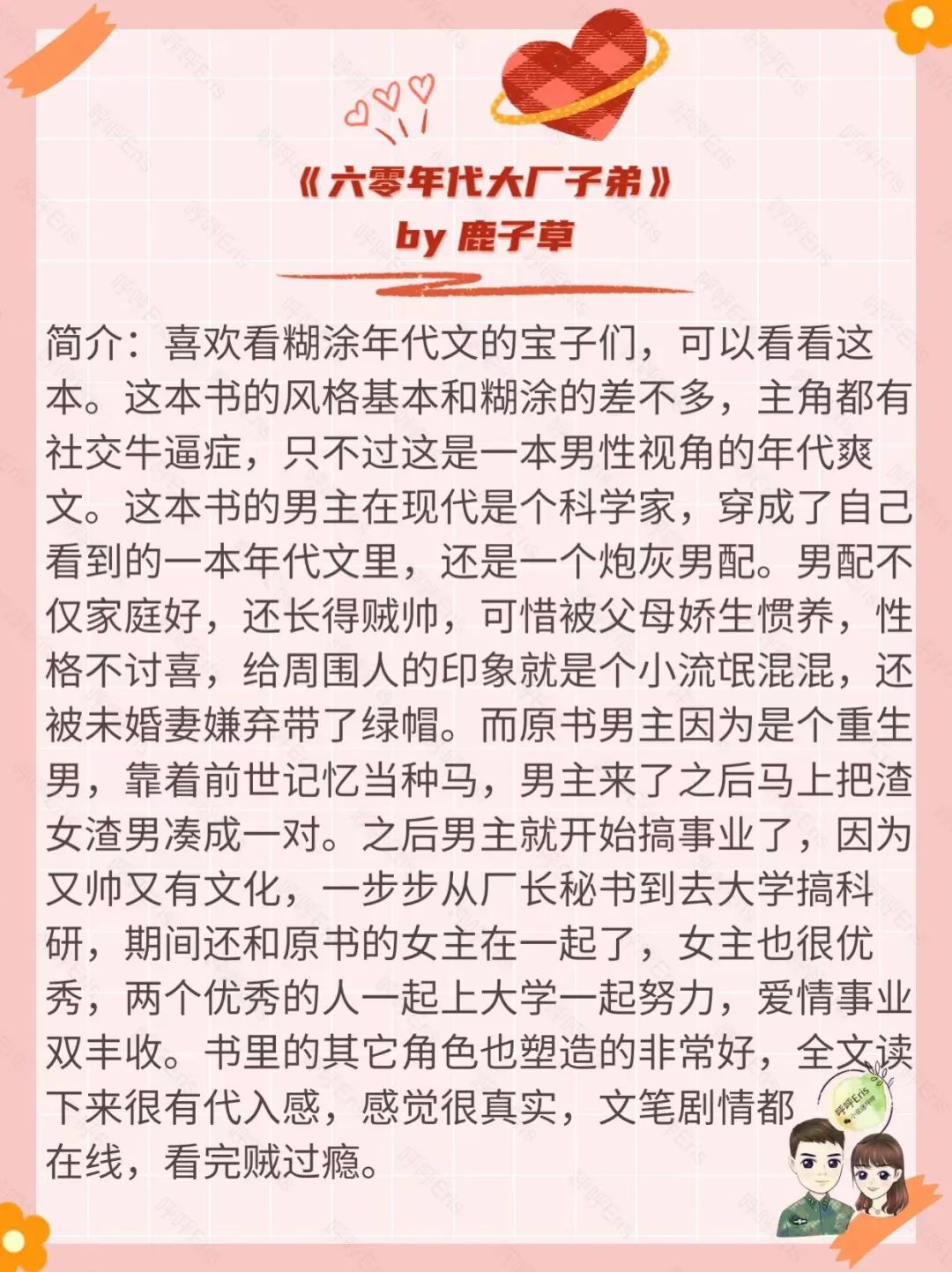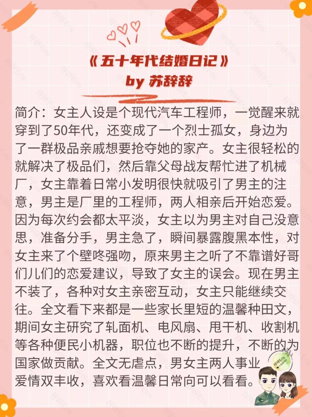 这本书女主人设是个理智冷静的技术女,男主是个占有欲超强的腹黑逗比男,整本书看下来非常轻松搞笑接地气。书的背景是50年代,因为咱们新中国刚成立,感觉那个时候真的是太不容易了。而女主在穿越前是个汽车工程师,穿过去不久就进了机械厂工作,男主是女主同事,对女主一见钟情,整本书讲的都是两人婚后日常以及女主利用自己的专业知识,搞的各种便民小发明,是一本温馨平淡的甜宠年代文。