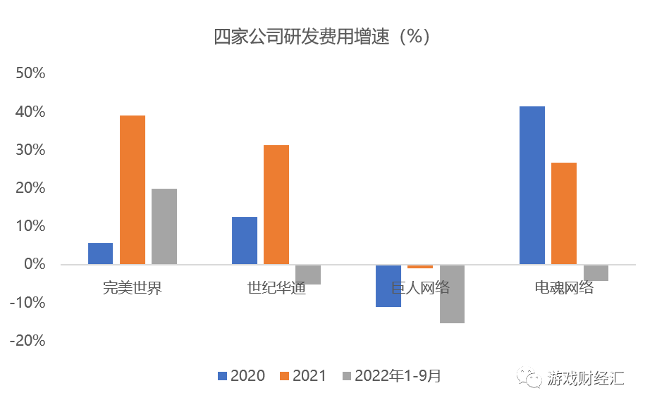 从研发费用来看,完美世界是真的在憋大招,研发费用连续三年同比上升,而世纪华通、巨人网络、电魂网络三家公司今年1-9月研发费用均出现下滑。