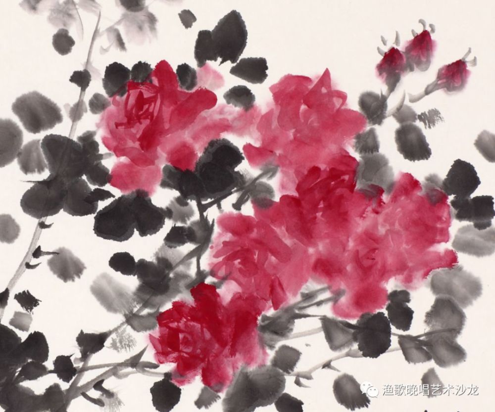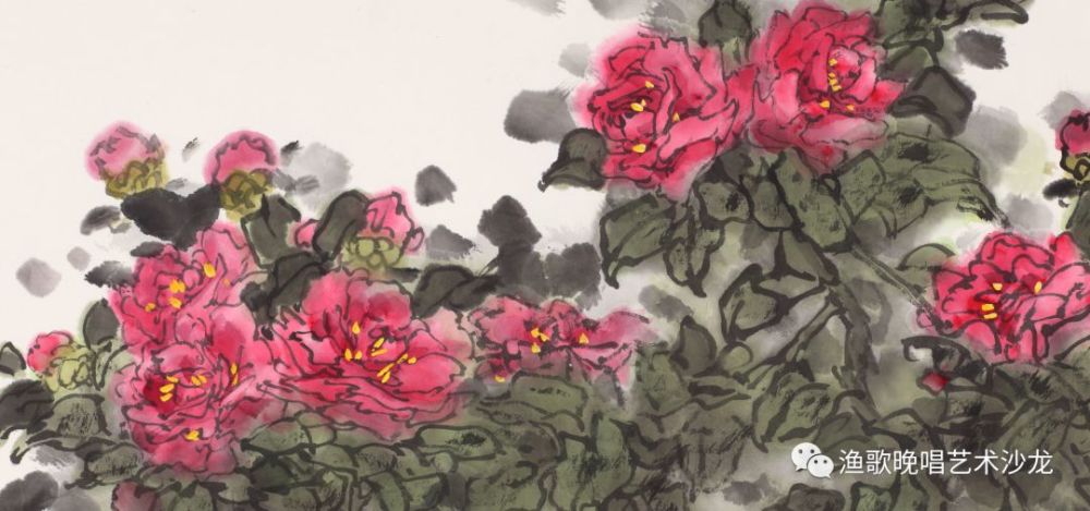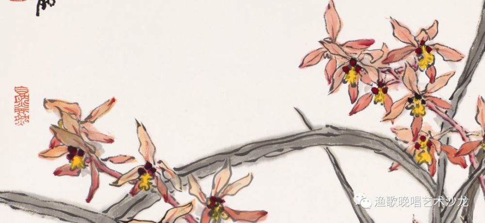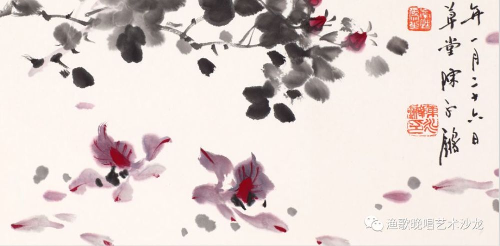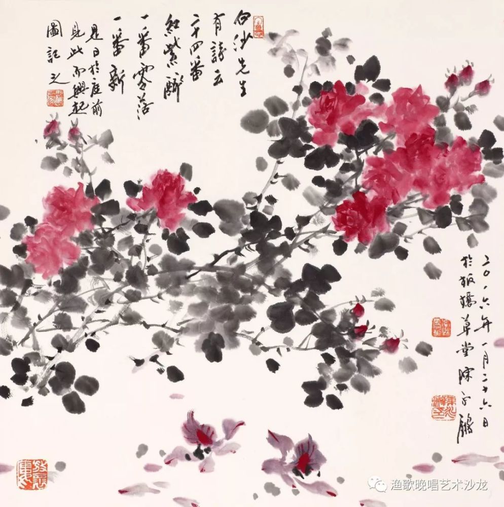 就如这幅《白沙先生有诗云》,花开花落两种对立的生命状态和谐呈现画面之中,顶上的花开热烈灿烂,尽显“生”的张扬,地下的花落余韵犹存,而不令人感伤,唤醒的反而是对当下的珍惜;与那枝头含苞待放的花骨朵相照应,尽显艺术家内心闲雅之情调,与旷达之怀抱。也告诉我们:春意正浓,眼前便是美好!
